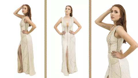 Vestido longo em crepe galiano, todo bordado com vidrilho e pérola.